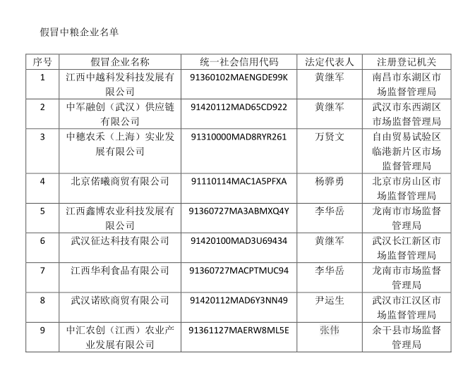 1.[江西中越科发科技发展有限公司]及其子公司[中军融创(武汉)供应链有限公司]、[中穗农禾(上海)实业发展有限公司]、[北京偌曦商贸有限公司]、关联企业[江西鑫博农业科技发展有限公司]、[武汉征达科技有限公司]、[江西华利食品有限公司]、[武汉诺欧商贸有限公司]、[中汇农创(江西)农业产业发展有限公司],与我司不存在任何隶属、投资、合作等关系,其一切行为均与我司无关。